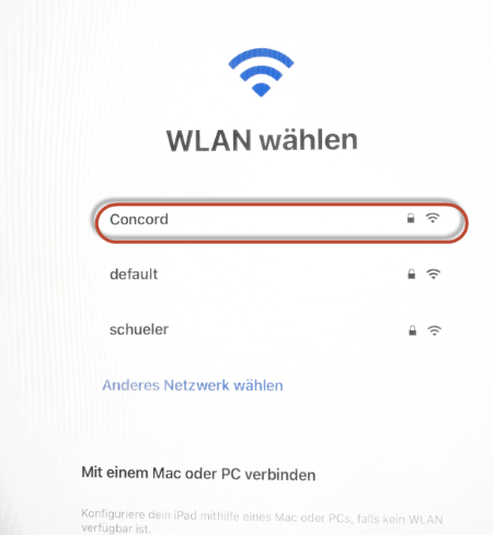 Für die Inbetriebnahme der iPads ist es vorteilhaft, wenn der IT-Betreuer der Schule vorab ein eigenes WLAN mit einfachem Kennwort aktiviert. Das korrekte WLAN für die iPads wird während der Inbetriebnahme automatisch über eine Richtlinie zugeordnet. Die Verwendung eines eigenen Setup-WLAN hat die Vorteile, dass die Schüler das WLAN-Kennwort der iPads nicht kennen (und für eigene Geräte zweckentfremden) und dass das Kennwort einfach einzutippen ist.