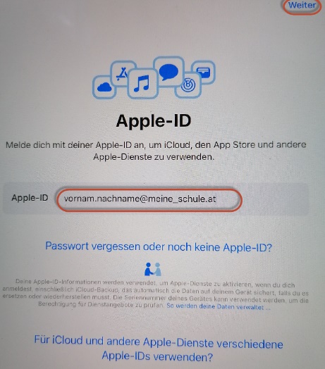 Benutzernamen: vorname.nachname@meineSchule.at oder eine andere Namenskonvention. |