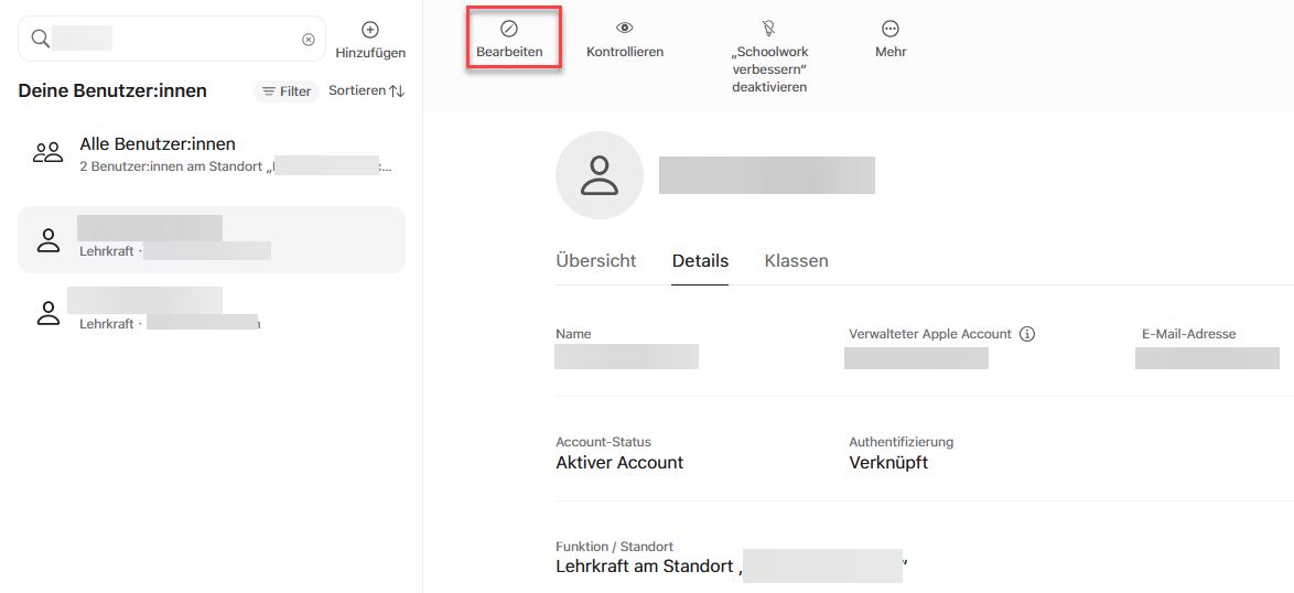 Die Funktion "Lehrkraft" kann bei der entsprechenden Person unter "Bearbeiten" eingerichtet werden. Nur Apple-IDs, die als Lehrkraft gekennzeichnet sind, können Klassen erstellen und in Apple Classroom diese Klassen verwalten und überwachen.