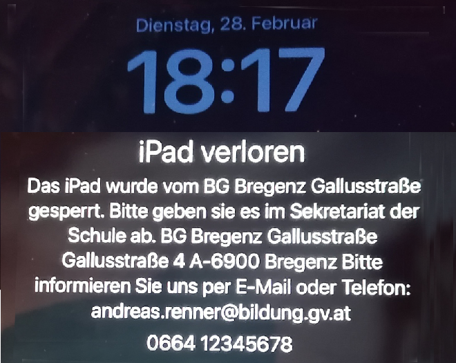Infos auf dem Sperrbildschirm festlegen: sinnvollerweise wird hier die Schule und die Lehrperson angegeben, bei der das iPad abgegeben werden soll.