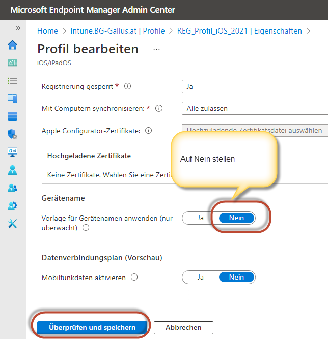 Will man die Änderung des Gerätenamens wieder blockieren, setze man die entsprechende Einstellung im Konfigurationsprofil wieder auf ja.