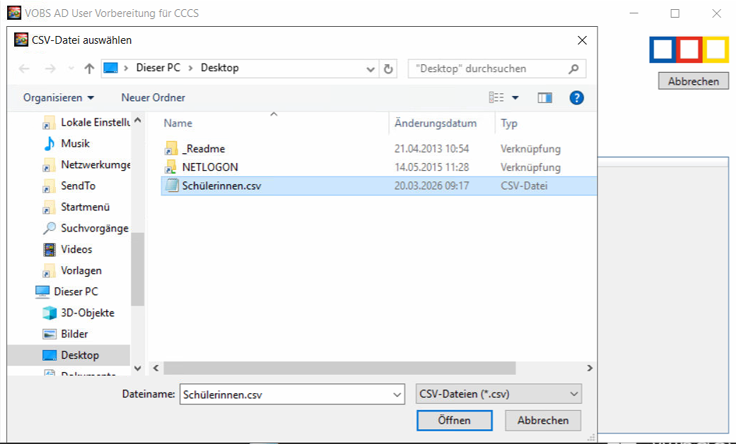 Mit der Schaltfläche "Usernamen (CSV) importieren" wird die vom Bildungsportal heruntergeladene Datei ausgewählt. Diese sollte dazu natürlich vorab auf den Domaincontroller kopiert worden sein: