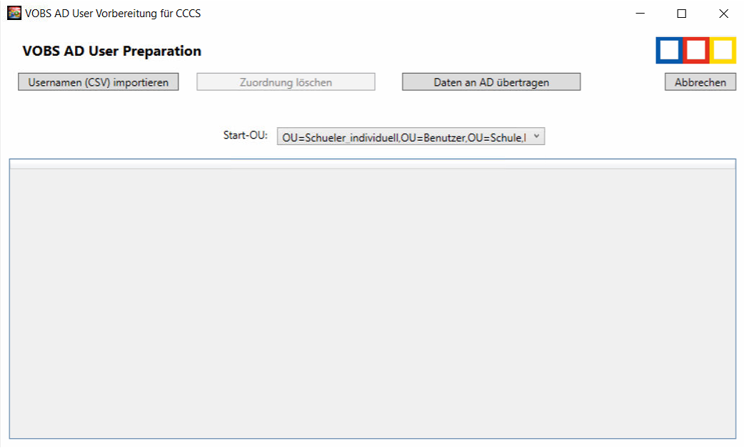 Im Auswahlfeld "Start-OU" werden alle im lokalen Active Directory gefundenen OUs angeführt. Hier wird angegeben, welche OU (inklusive der untergeordneten OUs) verwendet werden soll, um nach passenden Einträgen im Active Directory zu suchen. Es ist zu empfehlen, hier die niedrigstmögliche OU anzugeben, um alle Schüler:innenkonten zu erreichen, aber keine unnötigen Konten einzuschließen.