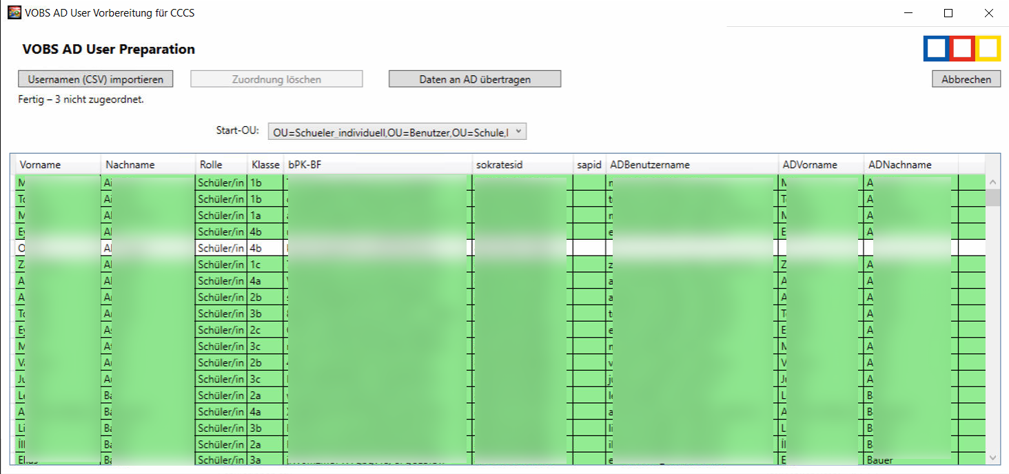 - weiße Zeile: zu einem Namen in der CSV-Datei wurde keine passende Übereinstimmung im Active Directory gefunden. Diese Konten müssen manuell zugeordnet werden. In diesem Beispiel sind davon drei Schüler:innen betroffen.