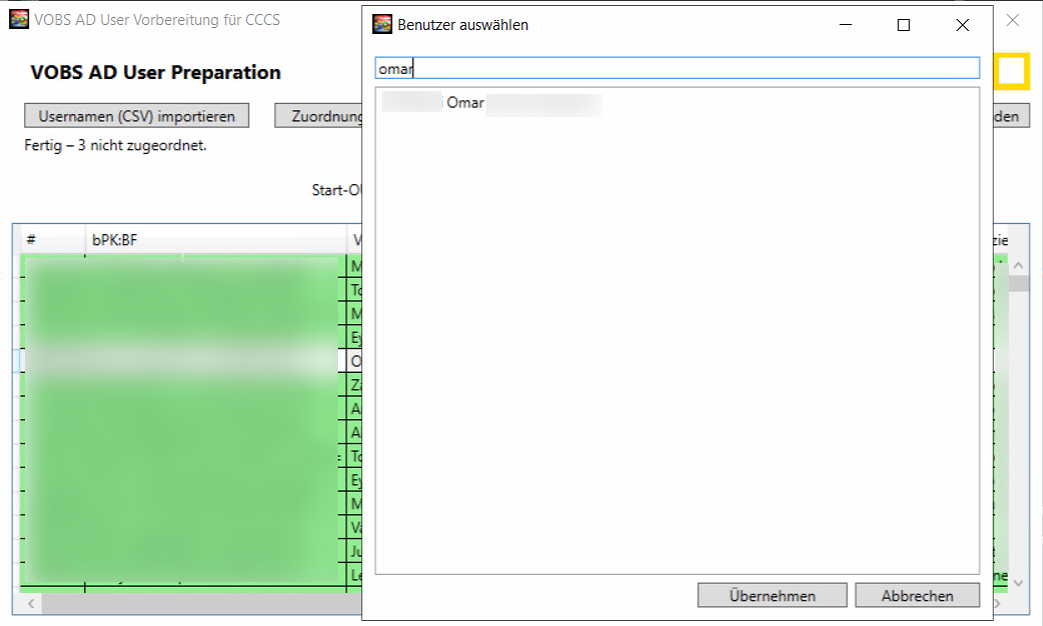 Umgehend nach dem Import gleicht das Programm die Namen aus der CSV-Datei mit den Namen im Active Directory ab. Dazu werden die Vornamen und die Nachnamen verglichen.