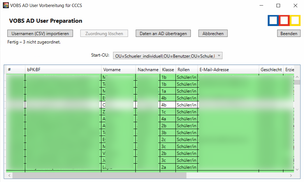 - weiße Zeile: zu einem Namen in der CSV-Datei wurde keine passende Übereinstimmung im Active Directory gefunden. Diese Konten müssen manuell zugeordnet werden. In diesem Beispiel sind davon drei Schüler:innen betroffen.