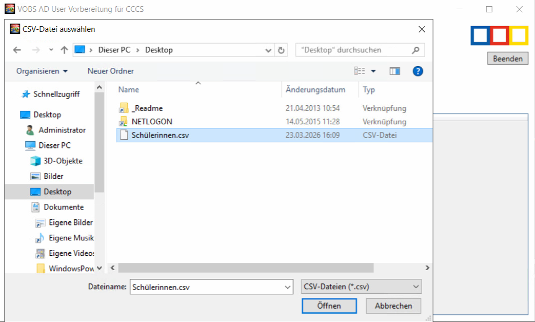 Mit der Schaltfläche "Usernamen (CSV) importieren" wird die vom Bildungsportal heruntergeladene Datei ausgewählt. Diese sollte dazu natürlich vorab auf den Domaincontroller kopiert worden sein: