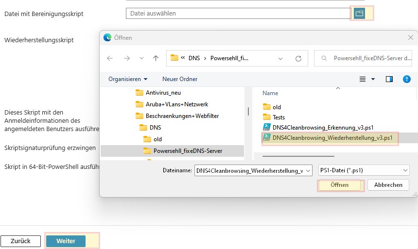 Codezeilen in Textdatei kopieren und z. B. mit Dateinamen DNS4Cleanbrowsing_Wiederherstellung_v3.ps1 abspeichern.