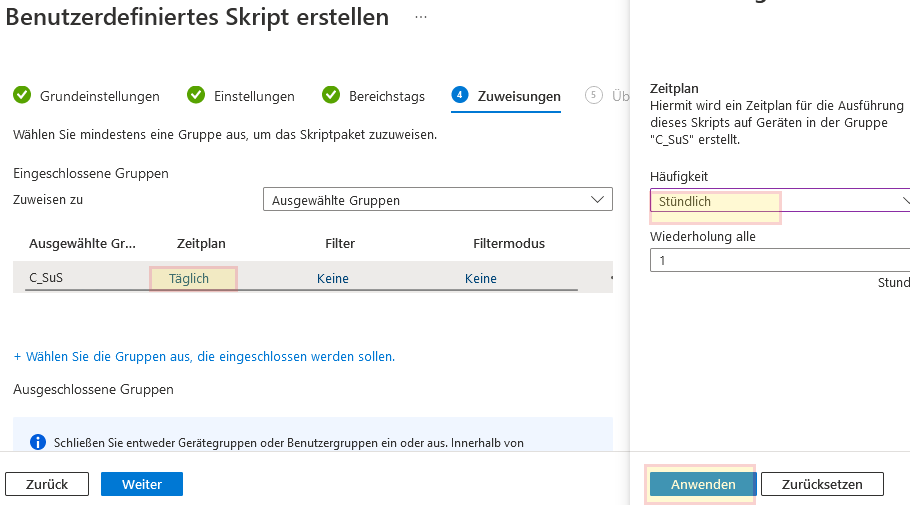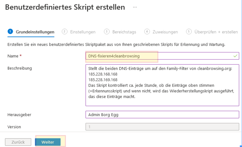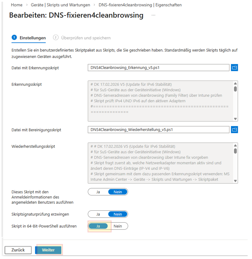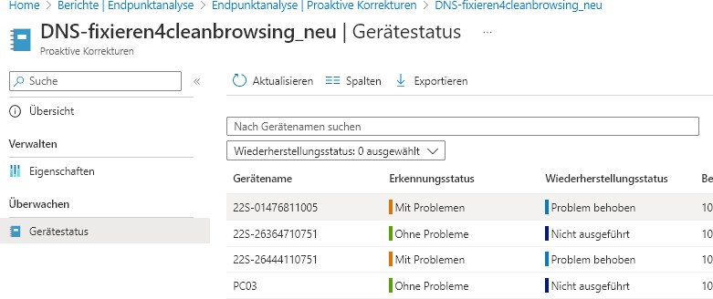 Damit wird ca. jede Stunde (hängt auch davon ab, wann sich ein Gerät wieder bei Intune „meldet“ = „Letzter Check-In“) kontrolliert, ob die beiden DNS Einträge 185.228.168.168 und 185.228.169.168 da sind (=Erkennungsskript). Wenn ja, passiert nichts, wenn nein, wird das Wiederherstellungsskript ausgeführt, welches besagte Einträge macht.