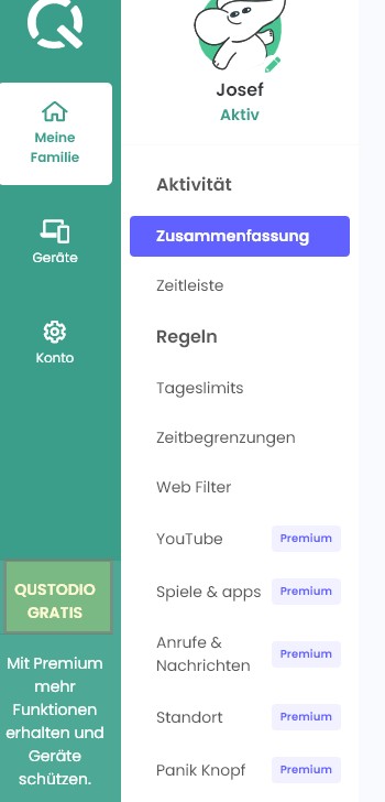Einige der Funktionen sind der kostenpflichtigen Version von Qustodio vorbehalten. Nach der Registrierung stehen die Premiumfunktionen drei Tage lang kostenlos zur Verfügung. Nach drei Tagen wechselt das Programm in den „Gratismodus“.