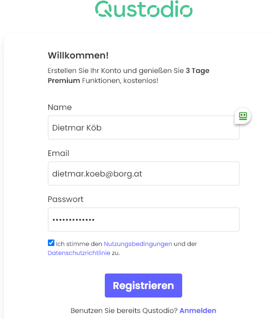 In Unterschied zu Variante 1 wird bei dieser Option das Programm nicht fix von der Schule über Intune vorgegeben. Die Eltern erstellen bei Qustodio einen Account und installieren das Programm (gemeinsam mit den SuS) auf dem Schülergerät. Es bietet sich an, diese Minianleitung den Eltern zur Verfügung zu stellen und damit die Entscheidung über eine „Beschränkung bzw. Überwachung“ den einzelnen Erziehungsberechtigten zu überlassen.