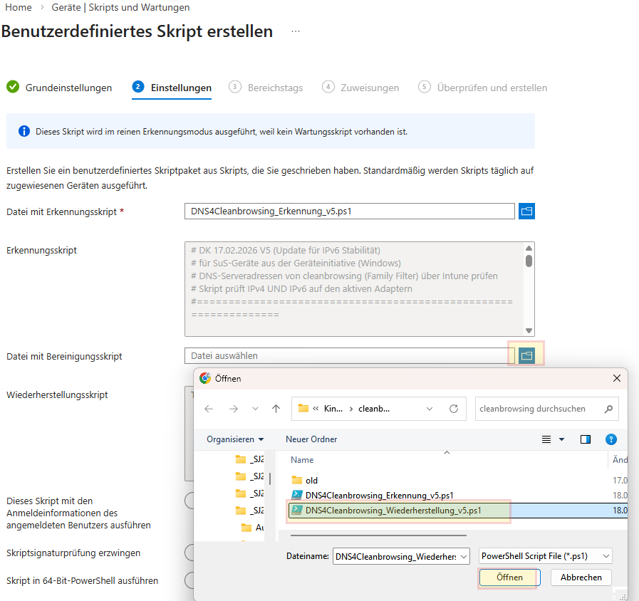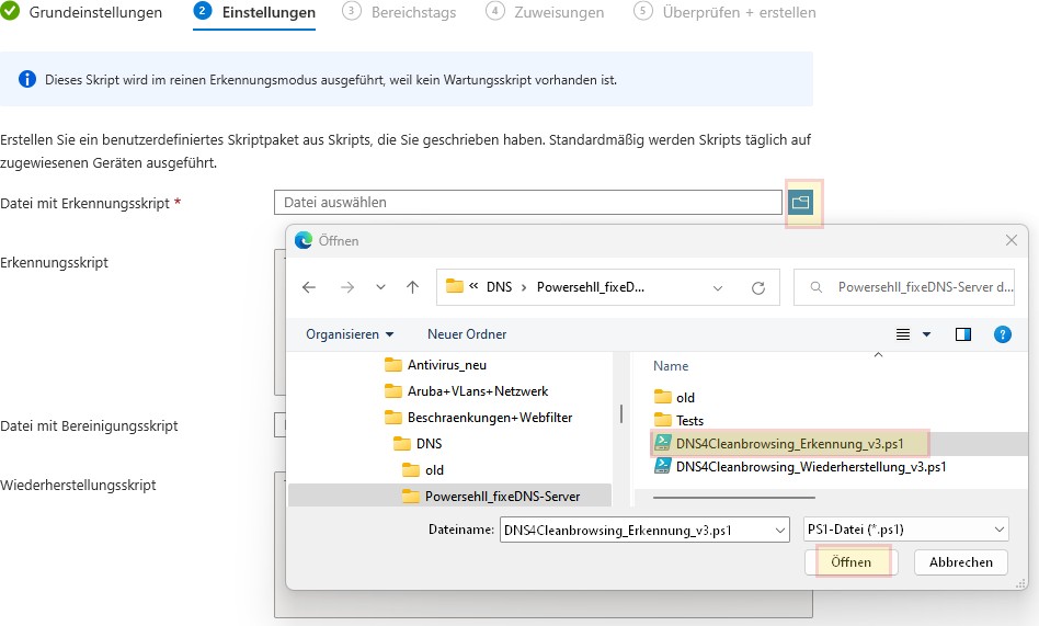 Diese Einstellungen geben wir als Schule über Intune über ein Powershell-Script vor. Leider hat sich in der praktischen Umsetzung ein neues Problem gezeigt (danke an die Tester): Wechselt ein angemeldeter Benutzer ohne Admin-Rechte die WLan-Verbindung, so „greift“ das Skript nicht, weil dieser Benutzer nicht die Rechte hat, die per DHCP zugewiesenen DNS-Einträge zu ändern. Über Intune zugewiesene normale Powershellskripte (wenn sie einmal funktioniert haben) werden kein weiteres Mal ausgeführt. Somit greift unser Skript nicht mehr.