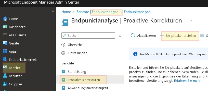 In Intune: Berichte -> Endpunktanalyse -> Proaktive Korrekturen: