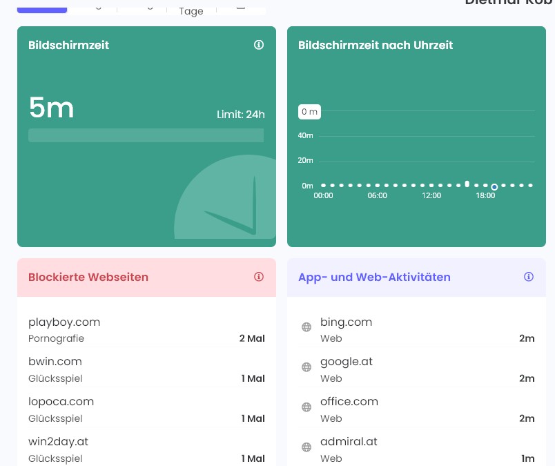 werden im Portal die Aktivitäten auf dem SuS-Gerät sehr detailliert angezeigt: Welche Seiten besucht wurden, welche Suchbegriffe eingegeben wurden, welche Webseiten blockiert wurden, die Bildschirmzeit …