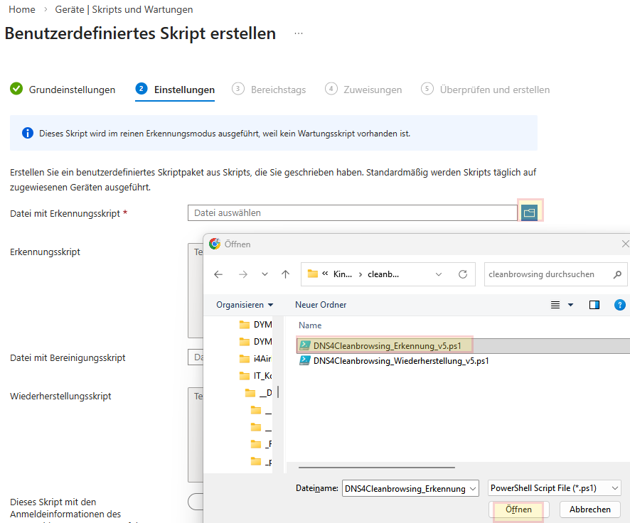 # Skript gemeinsam mit dem dazu passenden Erkennungsskript verwenden: MS Intune Admin Center -> Geräte -> Skripts und Wartungen -> Skriptpaket erstellen ...