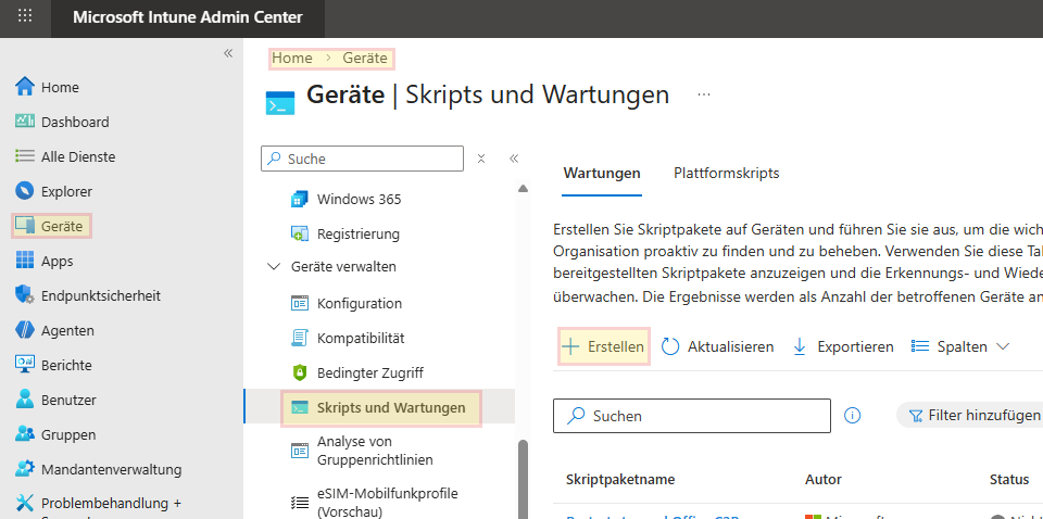 In Intune: Geräte -> Skripts und Wartungen -> "Erstellen"