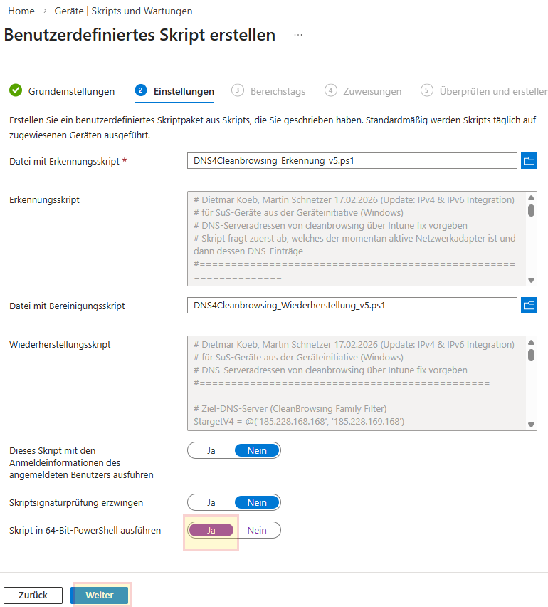 Damit wird ca. jede Stunde (hängt auch davon ab, wann sich ein Gerät wieder bei Intune „meldet“ = „Letzter Check-In“) kontrolliert, ob die beiden DNS Einträge 185.228.168.168 und 185.228.169.168 da sind (=Erkennungsskript). Wenn ja, passiert nichts, wenn nein, wird das Wiederherstellungsskript ausgeführt, welches besagte Einträge macht.