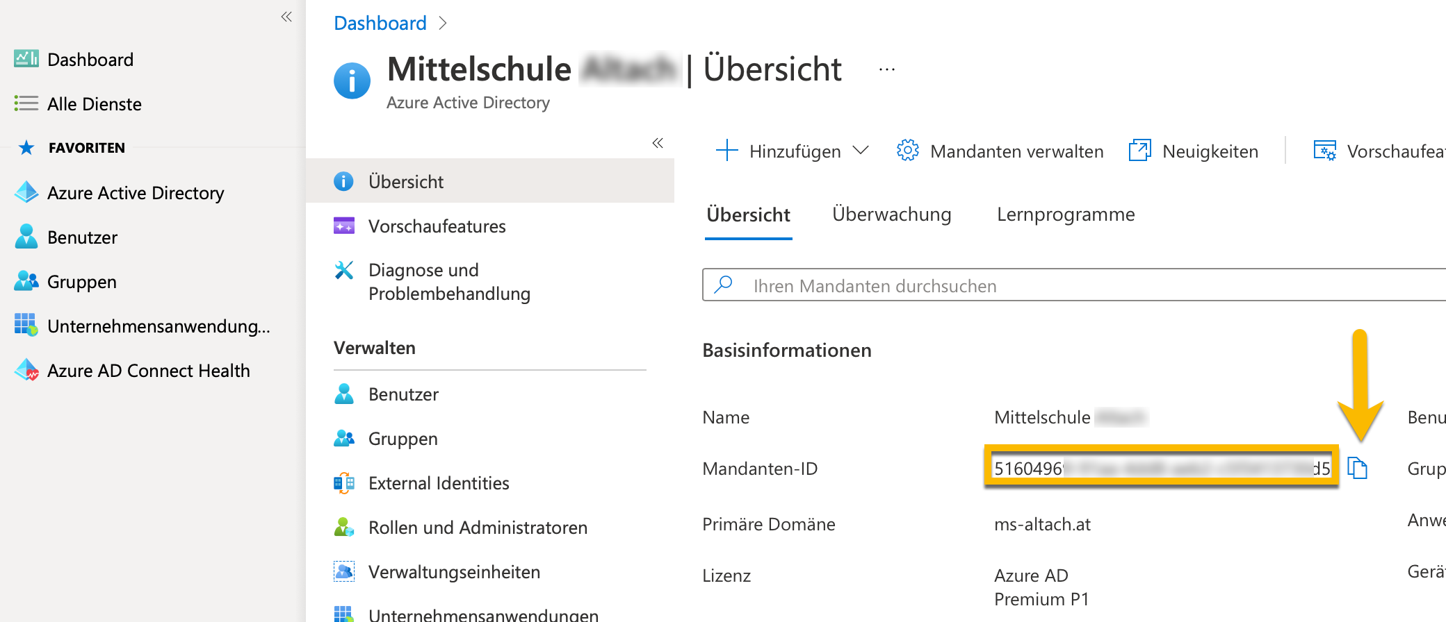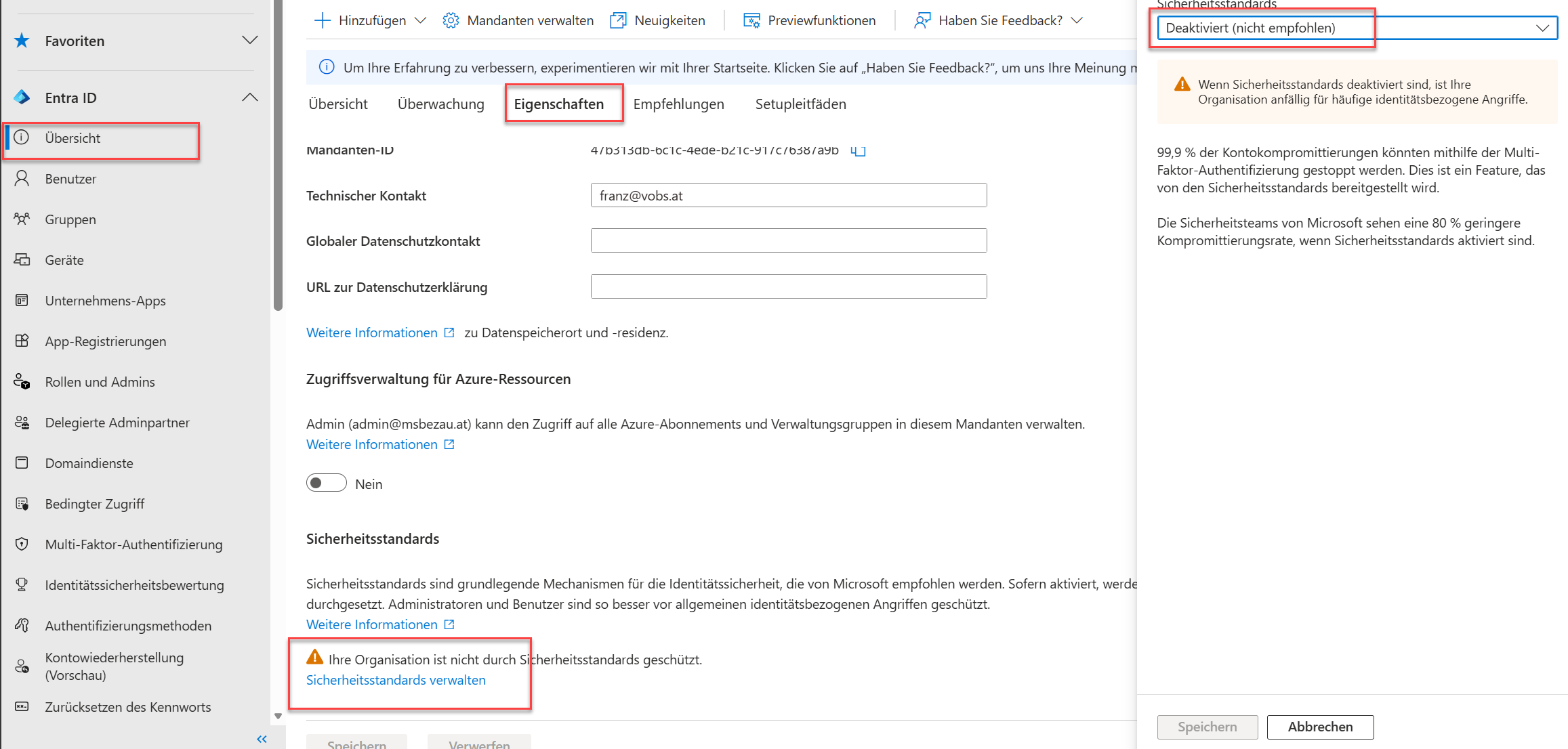 „Entra Admin Center – Übersicht – unten auf Menüpunkt „Eigenschaften“: