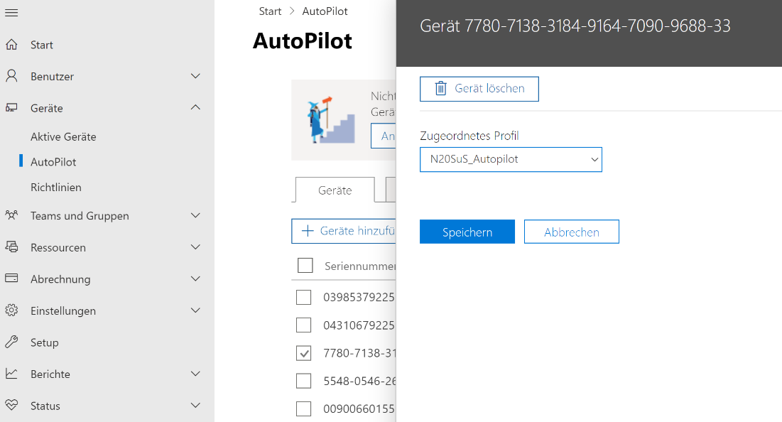 Microsoft 365 admin center > Geräte > Autopilot > Gerät auswählen und Profil zuordnen