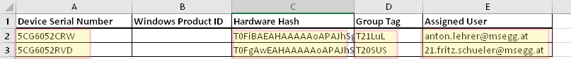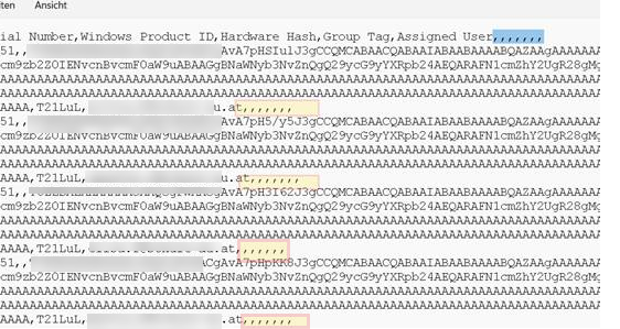 Vom Lieferanten bekommen wir bei den Windows-Tablets die Seriennummern und die dazu passenden Hardware-Hashes. Mit diesen beiden Werten kann die für den Autopilot-Import notwendige “csv-Datei” befüllt werden.