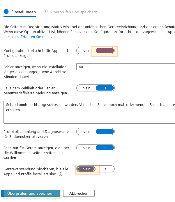 Wir aktivieren die Seite zum Registrierungsstatus. Damit wird auf den Clients der Bereitstellungsfortschritt angezeigt, wenn ein neues Gerät registriert wird. Die Benutzer sehen den Konfigurationsfortschritt der Registrierung, der Profile und der zugewiesenen Apps auf ihrem Gerät.