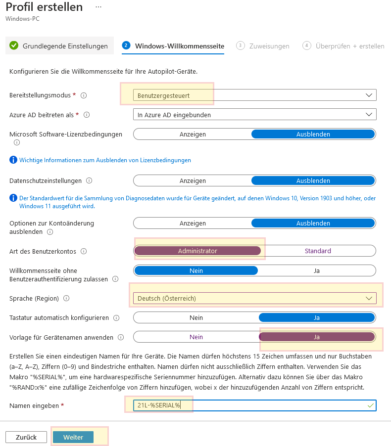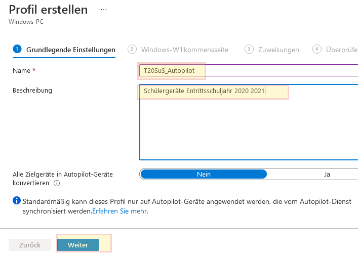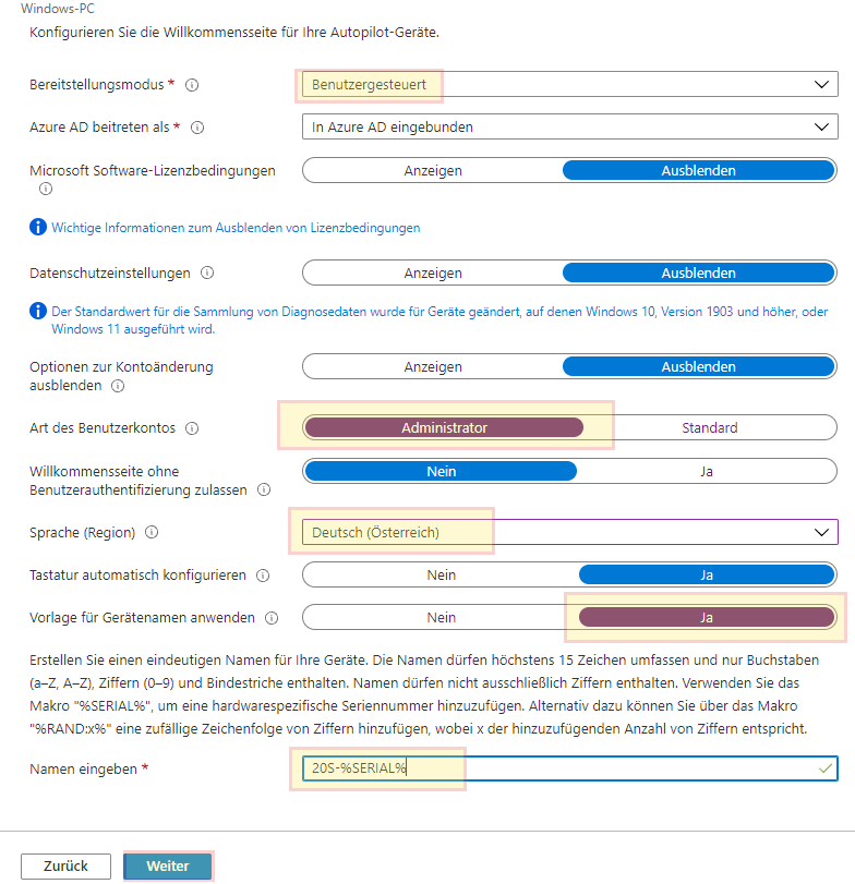 Für jeden Gruppentag (also dann auch für jede Gerätegruppe) muss ein eigenes Autopilot-Profil erstellt werden, in welchem dann auch der Gerätename definiert wird – z.B.: