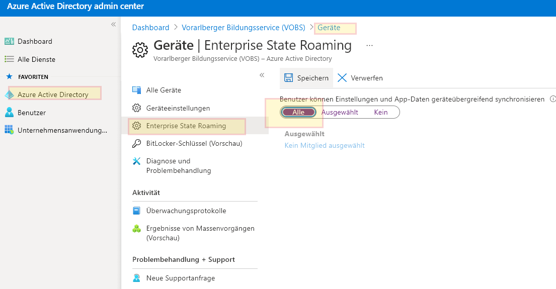 Im Azure Active Directory Admin Portal > Azure Active Directory > Geräte > Enterprise State Roaming