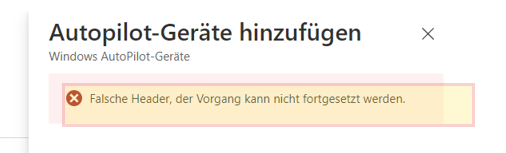 Intune quittiert in so einem Fall den Autopilot-Geräteimport per csv-Datei mit dem Fehler: