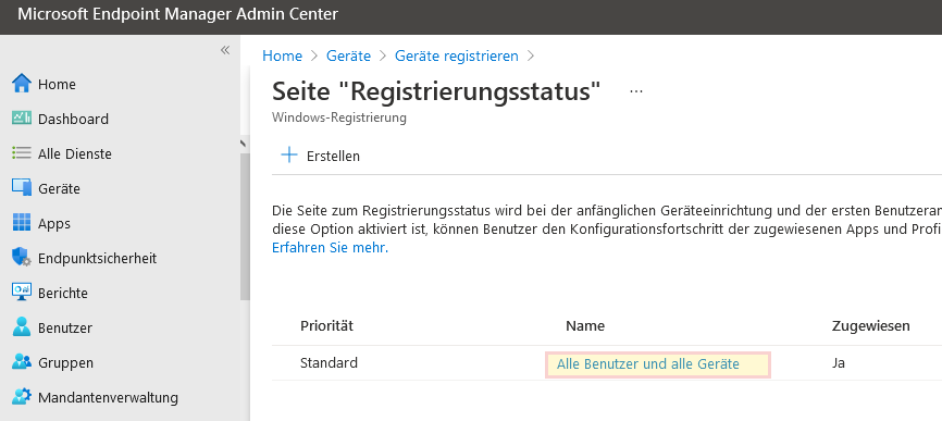Intune > Geräte > Geräte registrieren > Seite „Registrierungsstatus“: