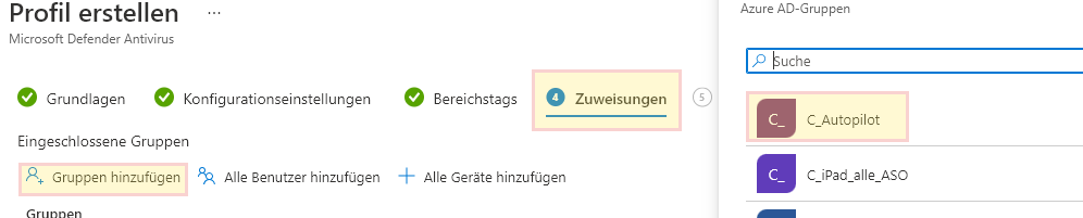 Wenn die Gruppe C_Autopilot und C_T21xxx bzw. C_N21xxx auftaucht (die Zuordnung wird durch die dynamische Richtlinie durchgeführt), so greift in weiterer Folge auch das entsprechende Geräteprofil bei der Anmeldung.