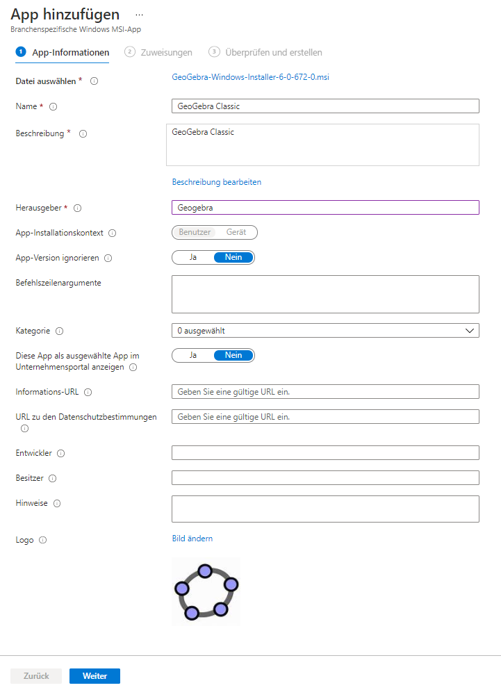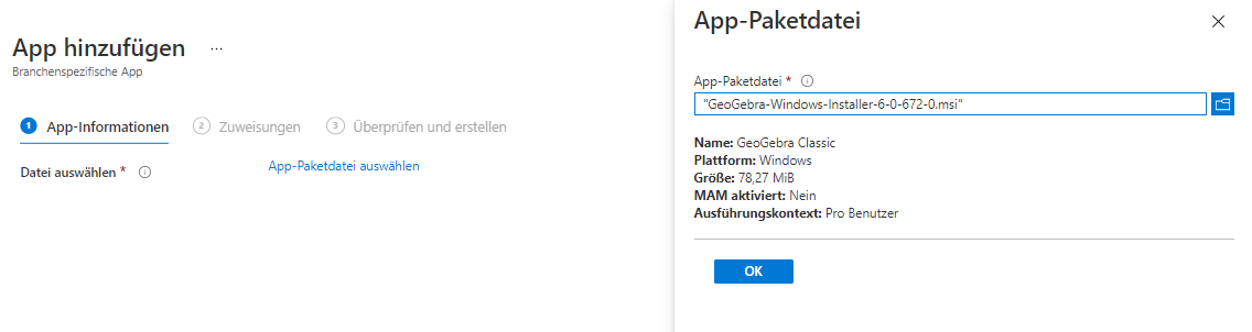 App Paketdatei auswählen > MSI-Paket auswählen > Herausgeber und evtl. Logo einfügen > erforderliche Gruppe zuweisen.
