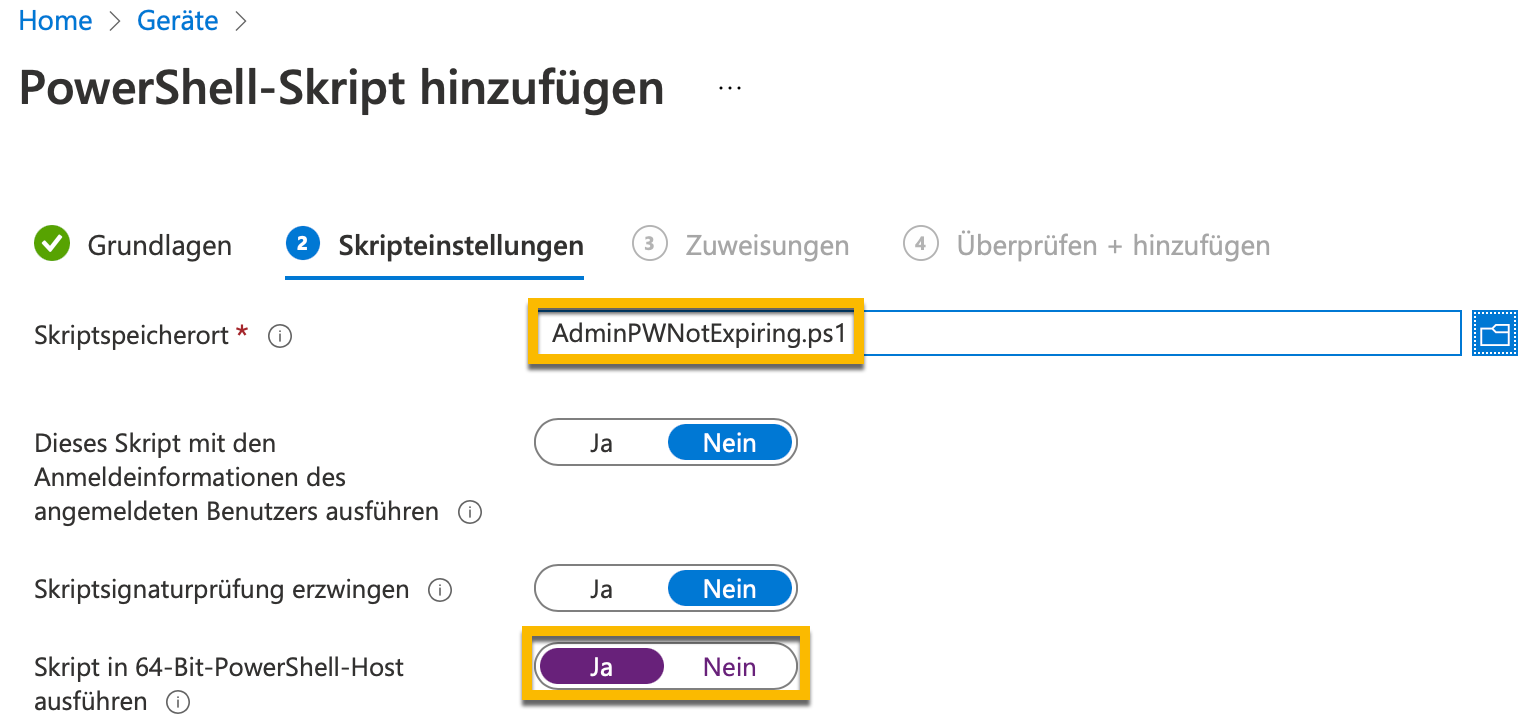 Dieses Skript muss als ps1-Datei abgespeichert werden (z.B. AdminPWNotExpiring.ps1) und unter Geräte – Skripts hinzugefügt werden (inkl. „Skript in 64-Bit-Powershell-Host ausführen“!)