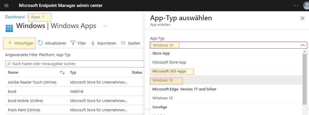 Apps > Windows > Hinzufügen > bei App-Typ unter der Kategorie „Microsoft 365-Apps“ „Windows 10“ auswählen: