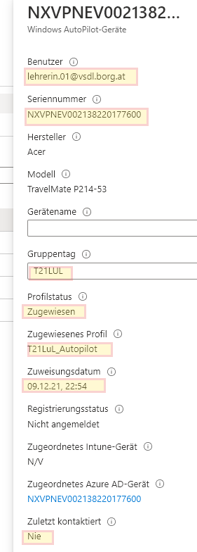 Klickt man auf eines der registrierten Geräte, so werden rechts die Details dieser Autopilot-Registrierung angezeigt: