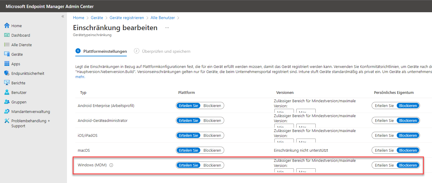 Endpoint Manager (=Intune: https://aka.ms/Intune) > Geräte > Geräte registrieren > Registrierungseinschränkungen > Geräteplattform > Windows-Einschränkungen > Alle Benutzer