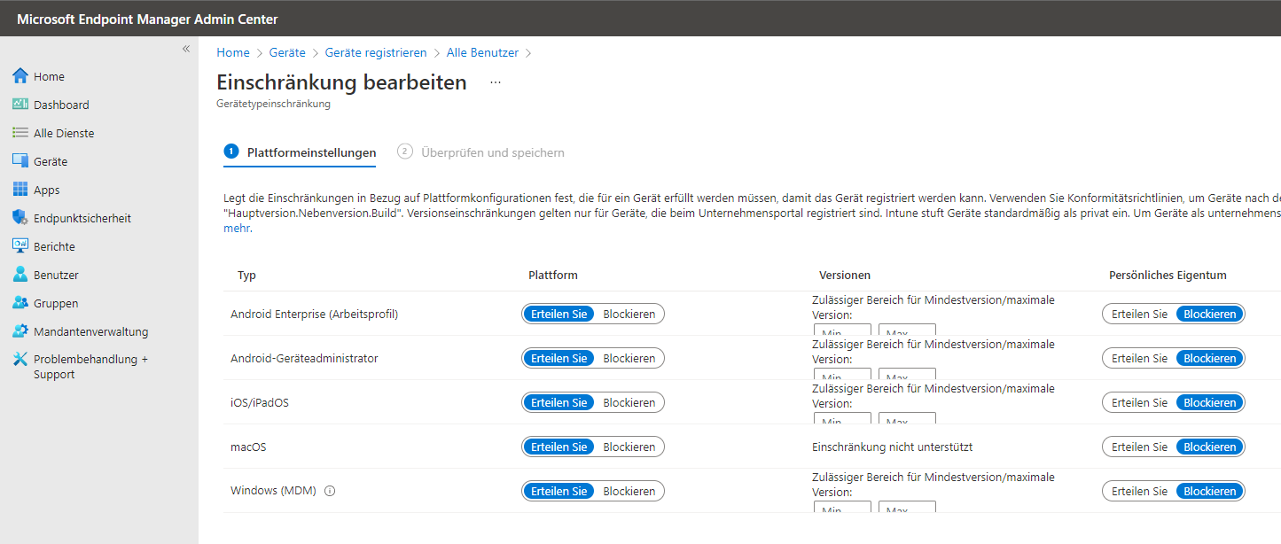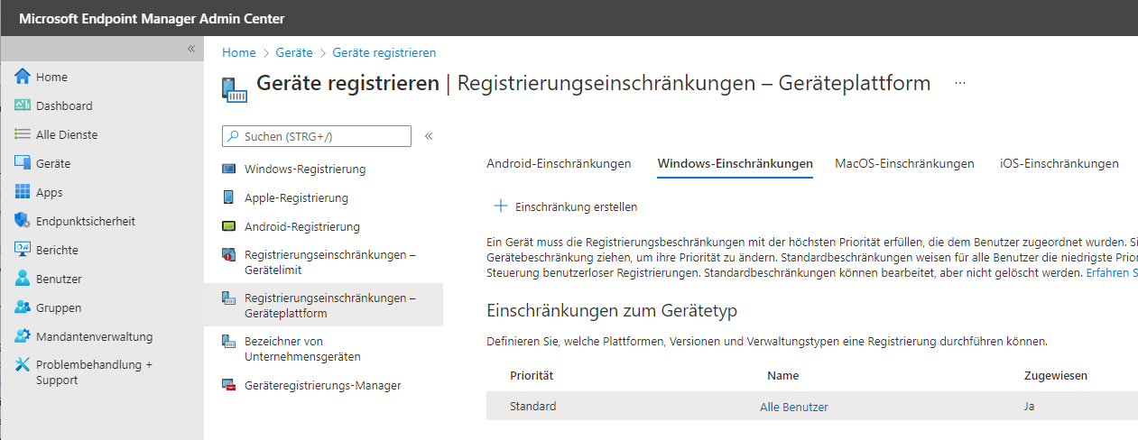 Endpoint Manager (=Intune: https://aka.ms/Intune) Geräte Geräte registrieren Registrierungseinschränkungen - Geräteplattform Windows-Einschränkungen Alle Benutzer