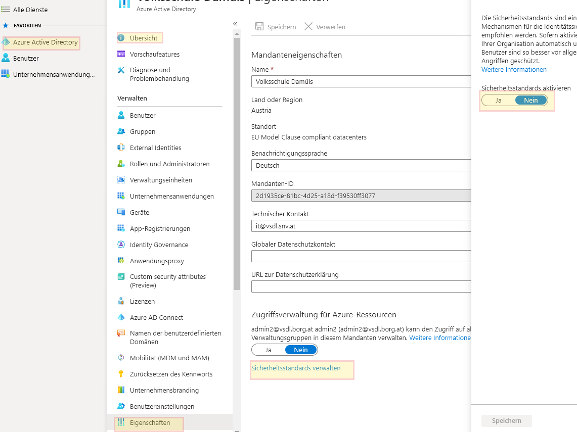 „Azure Active Directory“ – Übersicht – unten auf Menüpunkt „Eigenschaften“: