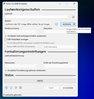 Nach dem Start von Rufus > Image mit AUSWAHL auswählen