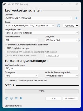 Es sind bereits die Einstellungen GPT und UEFI richtig eingestellt. Umgestellt muss das Dateisystem auf NTFS. Anschließend auf START klicken und warten