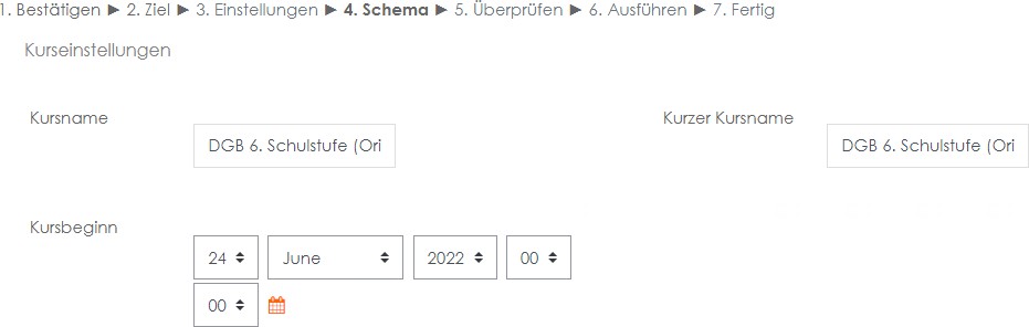 5. Weiter -> Weiter > beim Punkt 4. Schema kann der Kursname und der kurze Kursname bearbeitet werden.