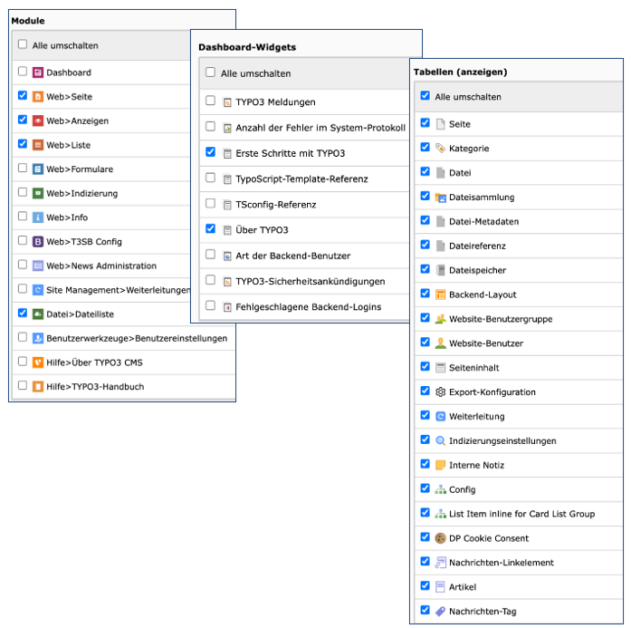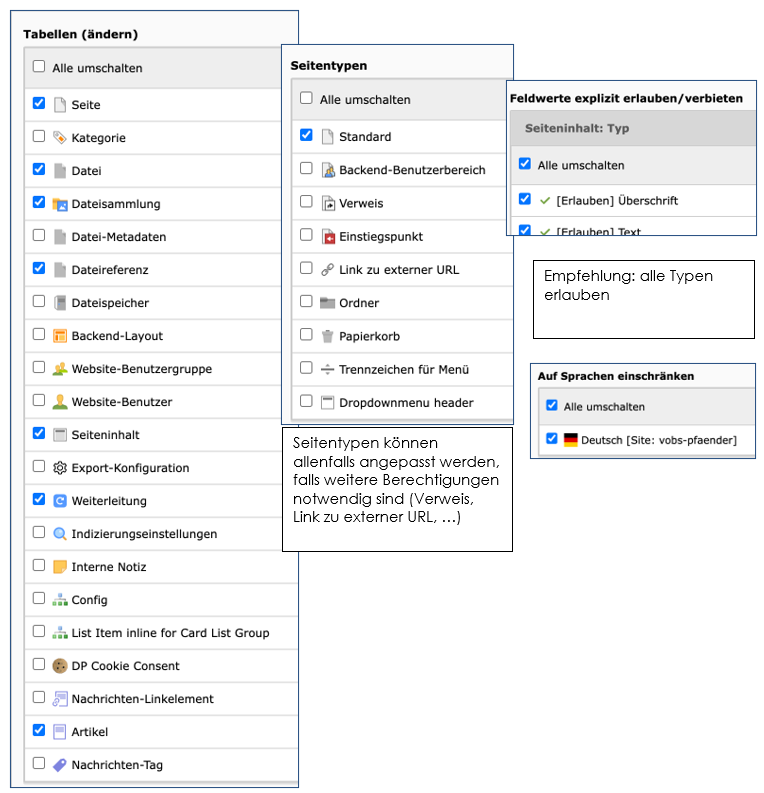Diese Teilberechtigungen können nicht nur für die Seitenstruktur, sondern auch für den Bereich der Dateiliste vergeben werden.