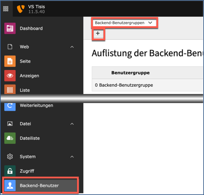Im Bereich „Backend-Benutzer“ wähle oben im Klappmenü „Backend-Benutzergruppe“ und klicke dann auf „+“, um eine neue Benutzergruppe für das Backend anzulegen. Das Erstellen einer neuen Benutzergruppe ist obligatorisch.