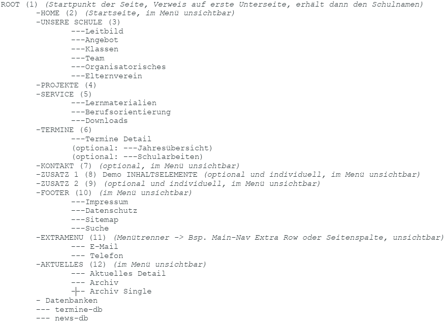 Zudem wird in der Sidebar ein Inhaltselement angelegt, welches alle Unterseiten der Hauptseite als Menü anzeigt. Auch dieses Inhaltselement (Menü) wird standardmäßig auf alle Unterseiten vererbt.