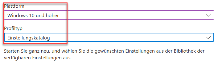 Neues Konfigurationsprofil erstellen: Windows 10 und höher > Einstellungskatalog. Sinnvollen Namen vergeben.